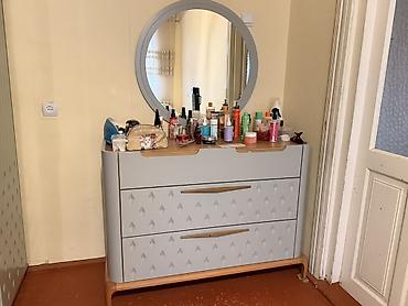 - Komod + dairəvi güzgü: üç geniş çekmece, üst tabla ağac teksturası ilə. Geniş güzgü rahat makiyaj və baxım üçün uyğundur.