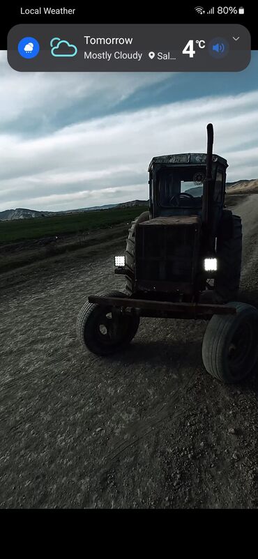 - Ön çıxıntılı egzoz borulu, kabinli təkərli kənd təsərrüfatı traktoru. Öndə kvadrat LED işıqlar quraşdırılıb, geniş arxa təkərlər və dərin protektorlu şinlər ilə sahə işlərinə uyğundur. Mexaniki sükan və kabində tam ön şüşə görünüşü var.