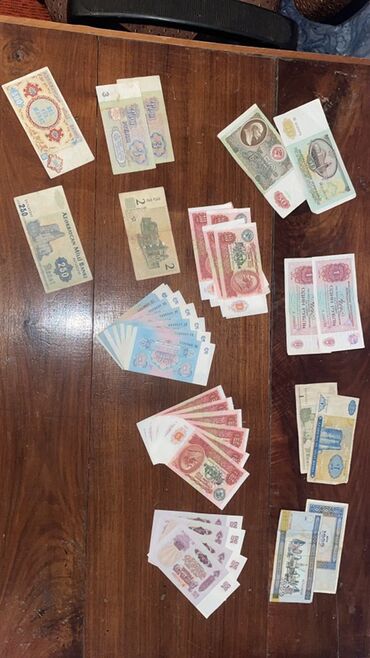 - Görünən nümunələr arasında sovet dövrü rubl/kopyek banknotları (müxtəlif nominal və dizaynlar), Azərbaycan manatı dövriyyədən çıxmış seriyalar, eləcə də digər regionlardan köhnə pullar var.
