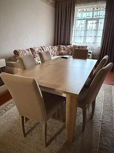 - Geniş yemək masası və 6 ədəd yumşaq oturacaqlı stul. Masanın üstü ağac teksturalı, düz konturlu; stullar eyni rəng palitrasında, yumşaq parça üzlük və rahat süngər oturacaqla.