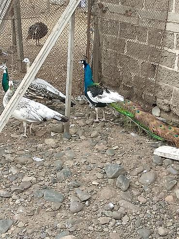 - Nadir rəng kombinasiyalı tovuz quşları saxlanılır. Şəkillərdə mavi-yaşıl baş-boyunlu, qara‑ağ ləkəli gövdəli erkək paun və bir neçə açıq rəngli/çəhrayı‑ağ dişi paun görünür.
