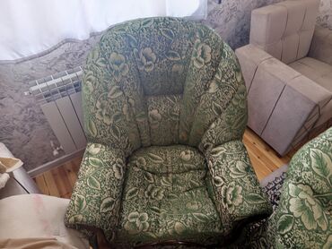 2 ədəd yumşaq kreslo dəsti - Model: klassik böyük ölçülü kreslolar, yüksək arxa hissə və geniş oturacaq - Material: parça üzlük, təbii tonlarda (yaşıl, boz, mavi qarışıq naxış); qol hissələrində d...