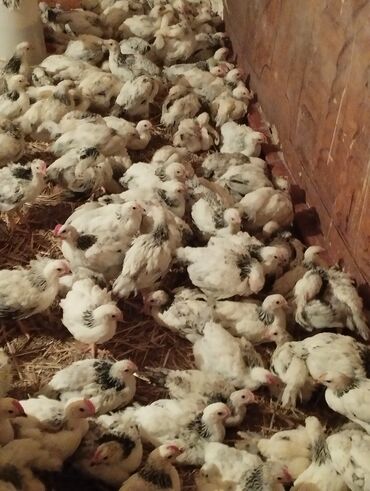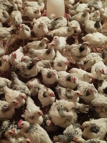 Məhsul: Qara-ağ ləkəli ətlik/yerli tip cücələr (toyuqlar) Təsvir: - Şəkillərdə göstərilən fermada toplu şəkildə bəslənən, aktiv və eyni partiyadan olan cücələr. - Rəngləri: əsasən ağ fon üzərində ...