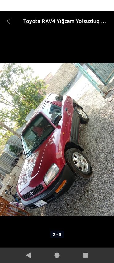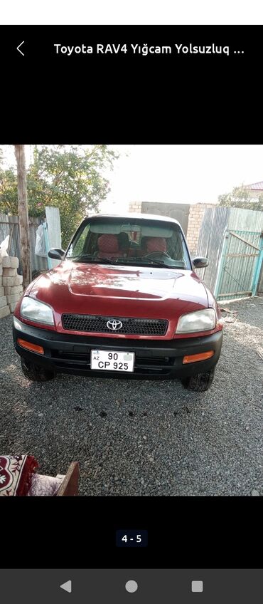 Toyota RAV4 (I nəsil) – benzinli, avtomatik ötürmə Kuzov: 5 qapılı, ağ rəng, arxa qapıda ehtiyat təkər Salon: parça oturacaqlar, ön oturacaqlarda üzlüklər, arxa oturacaqlarda başlıqlar, 3 nöqtəli t...