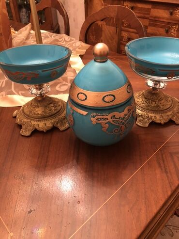 - Dəst: 3 hissədən ibarət – 2 ədəd kausa tipli şirniyyat qabı (ayaqlı) və 1 ədəd qapaqlı şirniyyat/konfet qabı.