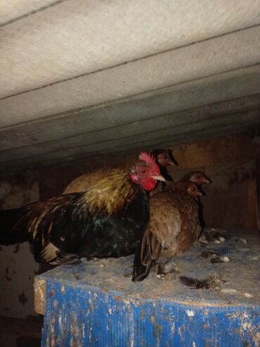 - Digər şəkillərdə bir qara-qızılı rəngli xoruz və bir neçə qəhvəyi rəngli toyuq təsvir olunub. Xoruzun boyun lələkləri qızılı, bədən hissəsi tünd (qara/yaşıl parıltılı), toyuqlar isə kompakt bədənli, qəhvəyi-ləkəli lələk quruluşuna malikdir.