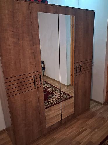 - 3 qapılı iri paltar şkafı – ortada tam boy güzgü panelləri, iki tərəfdə rəf və asılqan bölmələri, üfüqi dekor xətləri və metal tutacaqlar