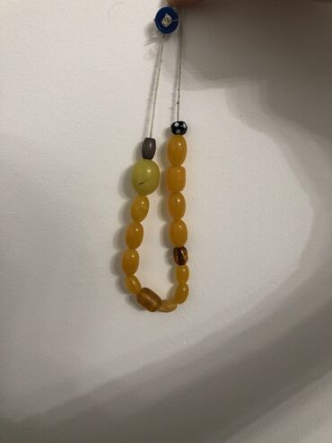 - Material: sarı və kəhrəba tonlarında iri yumru/oval bəzək muncuqları, arada tünd-şəffaf kəhrəba effektli muncuq; uclarda dekorativ qara-ağ nöqtəli və mavi düymə formalı bəzəklər