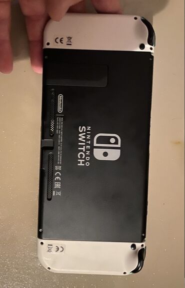 Nintendo Switch oyun konsolu – qara gövdə, ağ Joy‑Con panelləri ilə.