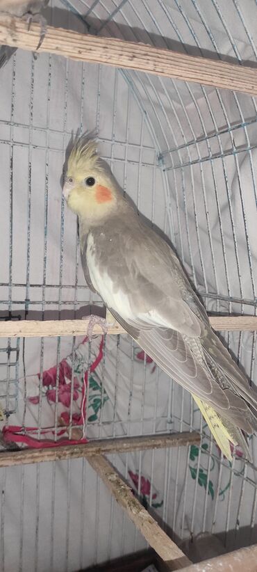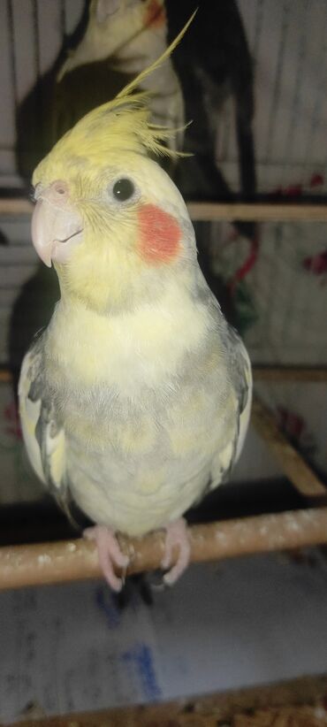 Nymph paraket (cockatiel) – boz və sarı tonlarda, yanaqlarda narıncı “yanaq ləkəsi”, başda xas toqqa. Fotolarda həm yetkin, həm də gənc quş görünür.
