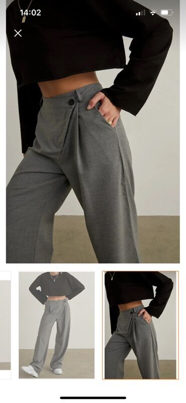 Qadın şalvarı 36 olcu– tünd boz/qaraya yaxın rəngdə, düz kəsim. - Model: high-waist (yüksək bel), geniş balaq, minimalist dizayn - Bağlanma: düymə və fermuar - Ciblər: ön və arxa klassik ciblər - M...
