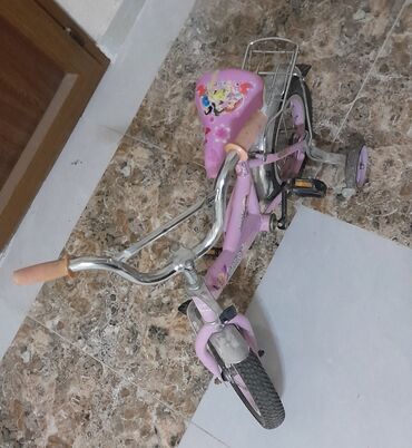 Uşaq velosipedi – balacalar üçün - Rəng: çəhrayı-ağ - Çərçivə: polad, dekorativ yapışqanlı naxışlar - Təkərlər: təxminən 12" ölçülü, qabaq və arxa şinlər çəhrayı, ağ disklərlə - Köməkçi təkərlər: ...