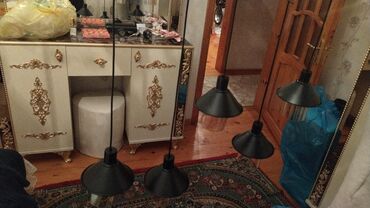 Tavan üçün 3ədəd dekorativ işıqlandırma 1) Bej-qızılı rəngli 5 qolulu lyustra - Material: metal gövdə, şüşə plafonlar (süd rəngi), bəzəkdə ağac və metal sferalar - Quraşdırma: tavan montajı, mərkə...