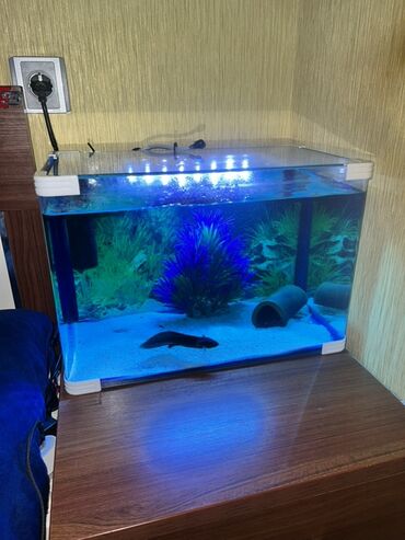Akvaryum komplekti – dekorativ və işlək - Şüşə akvaryum: düzbucaqlı, qabaqdan tam şəffaf görüntü. - Filtr və hava dövriyyəsi sistemi: solda yerləşən daxili filtr suyun təmizliyini və axını təmin e...