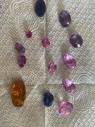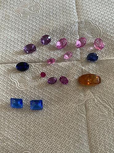 - Material xüsusiyyətləri (vizual müşahidəyə əsasən): şəffaf fasetli korund qrupuna bənzər mavi/çəhrayı daşlar, bənövşəyi daşlar ametistə bənzər, iri bal rəngli daş isə kəhrəba tipli görünüşdədir.