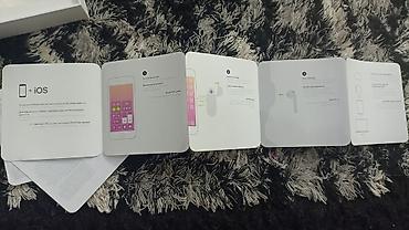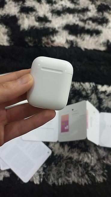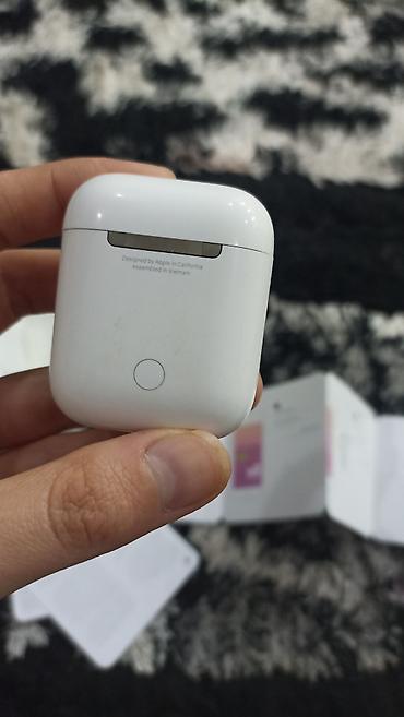 Apple AirPods (şəkillərdəki model) - Dizayn: Kompakt, ağ rəngdə MagSafe/Lightning şarj qutusunda. Qapaqda LED göstərici mövcuddur. - Funksiyalar: Apple cihazları ilə sürətli avtomatik qoşulma, tox...