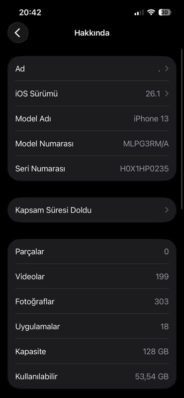 Apple iPhone 13 – Ağ rəng Əsas xüsusiyyətlər: - Yaddaş: 128 GB - iOS versiyası: 26.0 - Model nömrəsi: MLPG3RM/A - İkiqat kamera sistemi (geniş + ultra‑geniş), LED fləş - Ekran: Super Retina XDR - ...