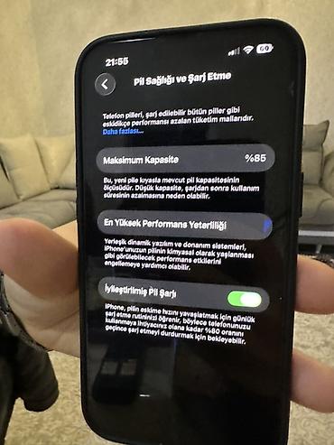 Şəkillərdə ekran və arxa panel, kənar hissələr, eləcə də “Pil Sağlığı və Şarj Etmə” bölməsi (85%) göstərilib. Face ID çentiği olan tam ekran dizaynı, iki kameralı modul və LED flaş aydın görünür.