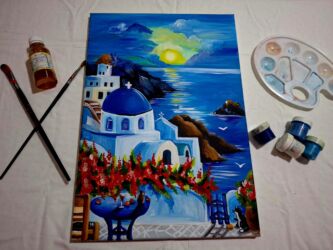 - Kompozisiya: Ön planda mavi günbəzli kilsə/ev kompleksləri, qırmızı çiçəklərlə bəzədilmiş eyvan, masa və dekor detallar; arxa planda üfüq xətti boyunca buludların arasından çıxan günəş, dərin mavi dəniz və qayalı sahil.