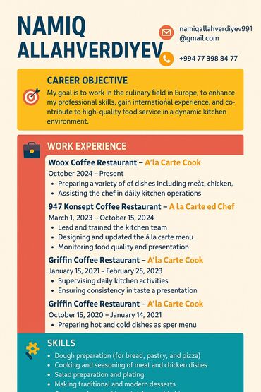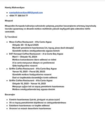 Adım ramizdir qazan manqal vs yeməkləri bacarıram təcrübəliyəm Peşəm