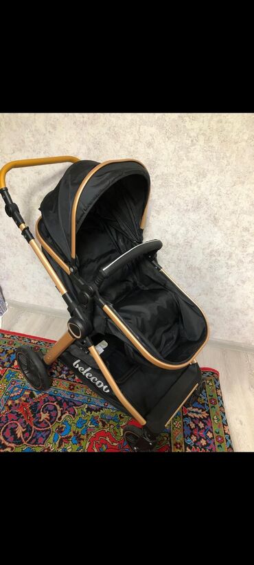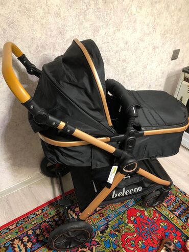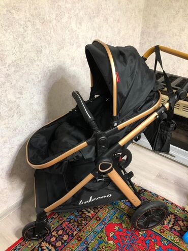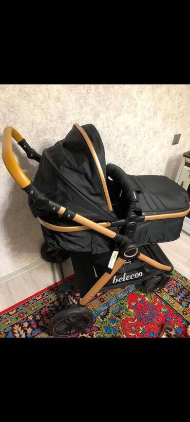 QaraBələcoo uşaq arabası – qara rəng, qızılı/şampan tonlu alüminium şassi ilə.