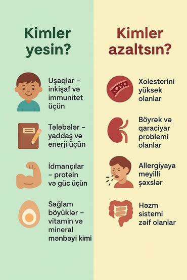 - Xolesterini yüksək olanlar, böyrək və qaraciyər problemi olanlar, allergiyaya meylli şəxslər və həzm sistemi zəif olanlar istifadəsini azaltmalıdır.
