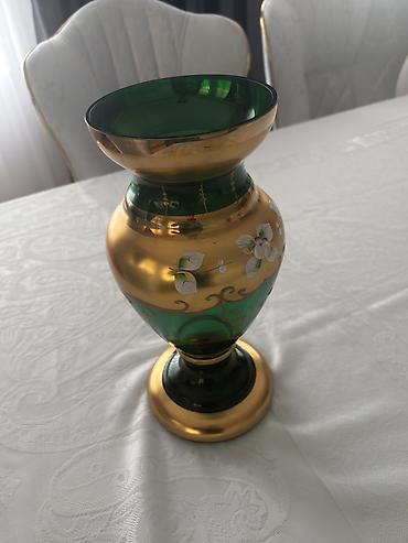 Bohem şüşə dekor dəsti 100manat - Rəng: zümrüd-yaşıl əsas, qızılı haşiyə və əl işləməsi çiçək naxışları - Material: qalın bədii şüşə - Komplekt: 3 hissə - 1 ədəd böyük vaza (ensiz boğazlı, dekor...