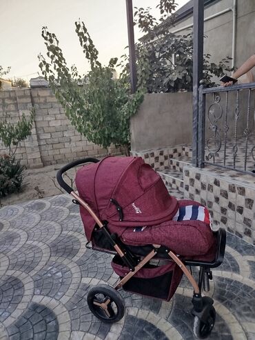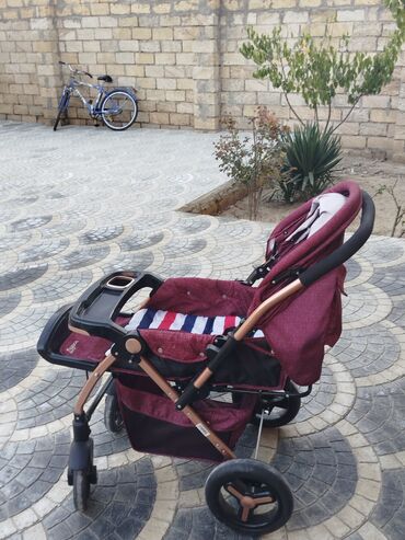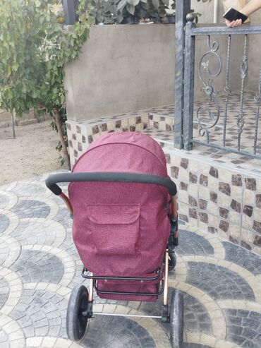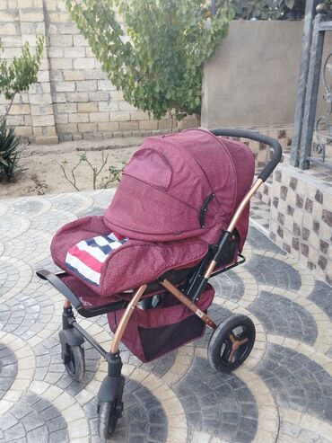 Uşaq arabası – bənövşəyi/bordo rəng, qızılı çərçivə və qara detallar