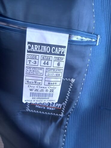 Kişi kostyumu – Konsey Men’s Wear - Model: Slim (etiketdə “slim”) - Naxış: Xırda şaquli zolaqlı tünd boz rəng - Ölçü: 48, Drop 6 - Parça tərkibi: 70% viskon, 30% polyester - Daxili astar: Naxışlı ...