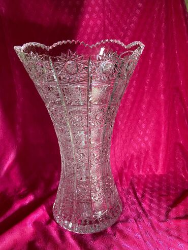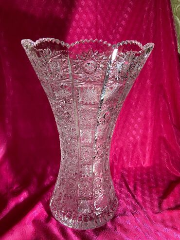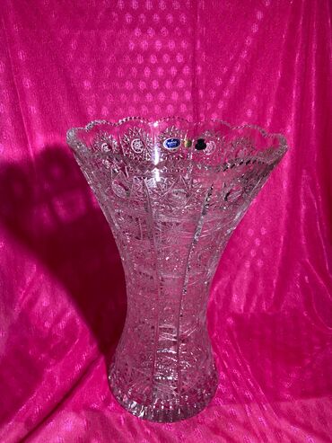 əl işi yuqoslav kristal . hər tərəfi xirda əl işi ilə işlənmiş,45 yaşi var.,antikvar. Satişda olmamiş. Ölkəmizə 3 dənə qəririlmişdir 5 bucaq.böyük, ağir meyvə qabiağ rənqdə