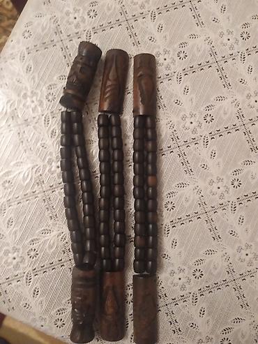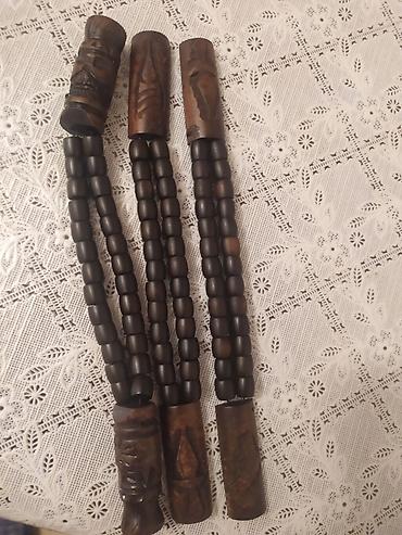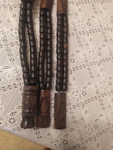 - Qara-qəhvəyi taxta muncuqlardan düzəldilmiş 3 ədəd uzun təsbeh. Hər birinin başlıq hissəsi əl oyma naxışlarla bəzədilib. Muncuqlar oval formadadır, ip üzərində sıx düzülüb. Etno üslublu dekor, kolleksiya və meditativ çevirmə üçün yararlıdır.
