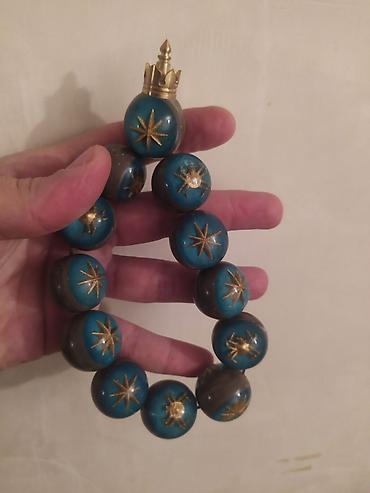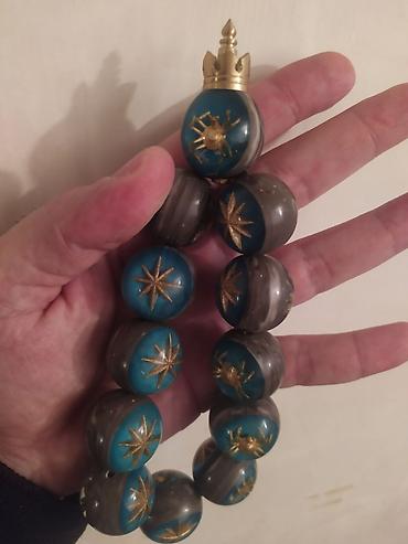 - Mavi-boz tonlarda iri sferik muncuqlardan hazırlanmış bəzək təsbehi. Hər muncuğun üzərində qızılı rəngdə ulduz və xərçəng fiqurları işlənib. Üst hissəsində tac formalı metal başlıq yerləşir. Kolleksiya və interyer üçün dekorativ aksessuar kimi nəzərdə tutulub. Muncuqlar elastik iplə birləşdirilib, əlində çevirməyə və vitrin-bəzək kimi sərgiləməyə uyğundur.