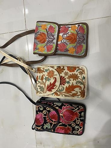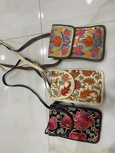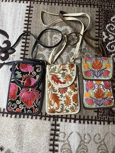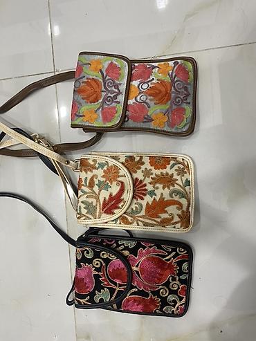 - Material: parça üzərində rəngbərəng ipək/sapla zəngin dekorativ naxış; kənarları və qayışları süni dəri ilə tamamlanıb.