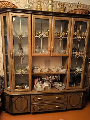 - Böyük vitrin/servant (ağac fakturalı karkas, şüşə qapılar, qızılı dekorativ barmaqlıqlar, mərkəzdə açıq rəf zonası, aşağıda 2 çekmece və 2 yan dolab)