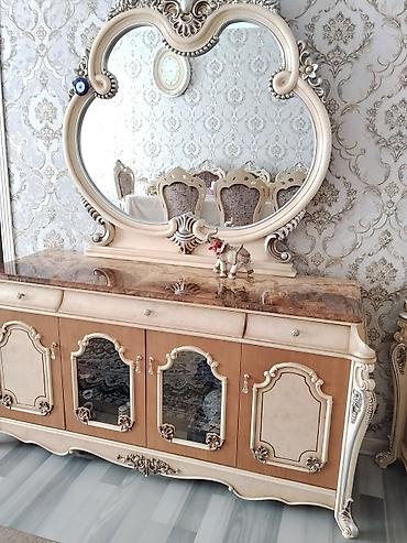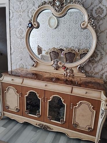 - Bufet/komod: mərmər naxışlı üst tabla, iri dekorativ güzgü, yuxarıda 2 çekmece, aşağıda 5 qapılı bölmə (3-ü şüşəli)
