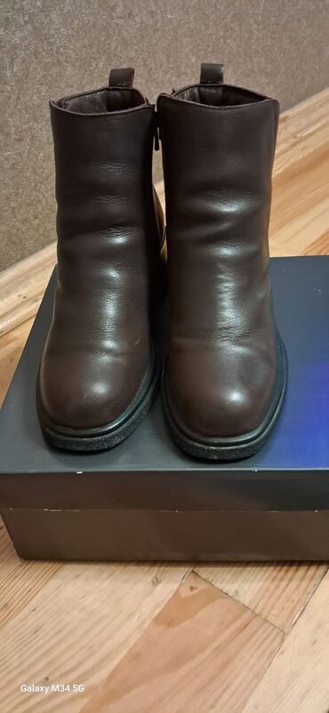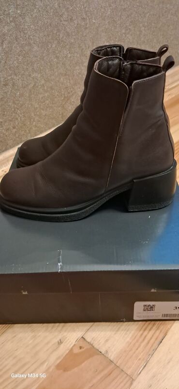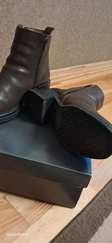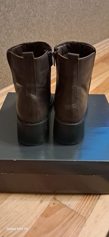Qadınlar üçün dəbli qısa çəkmələr - Material: yumşaq nubuk , brend Sandro Vicari italiya - Rəng: tünd boz-bənövşəyi ton - Dizayn: ön hissədə geniş laklı dəri qayış və iri metal toka; tokada dekora...