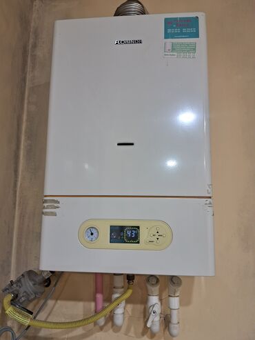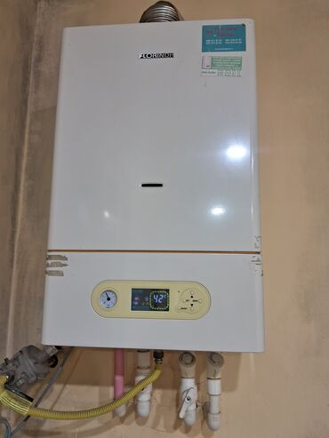 - Aşağı hissədə standart qoşulmalar: qaz xətti (sarı boru), istilik gediş-gəlişi və isti/soyuq su giriş-çıxışları