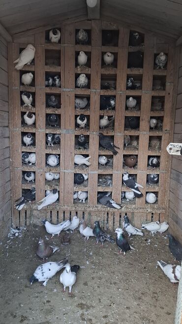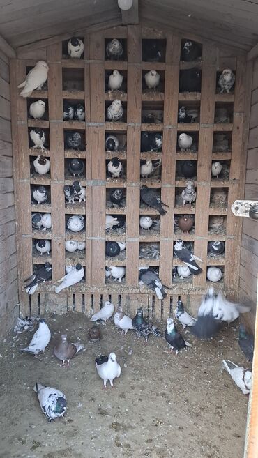 Məhlə şəraitində saxlanılan müxtəlif rəng və naxışlarda ev göyərçinləri dəsti. Xüsusiyyətlər: - Rənglər: ağ, qara, boz, qarışıq (ağ-qara, qəhvəyi-ağ və s.) - Say: şəkillərdə bir neçə cüt və gənc f...