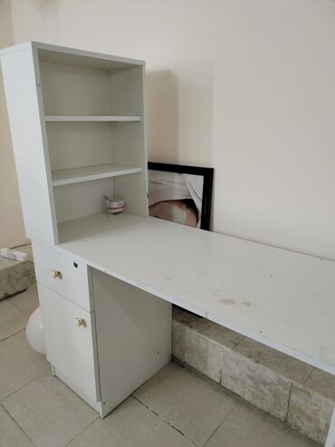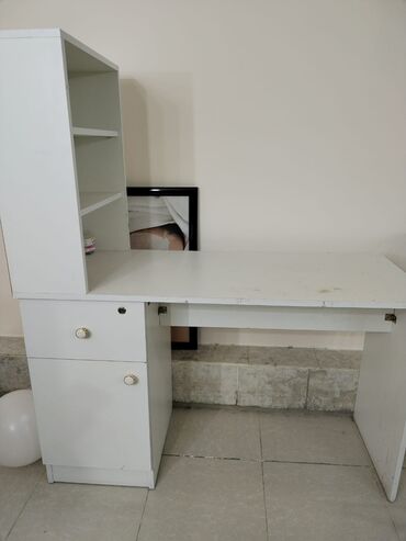 - Ağ rəngdə iş masası: sağda geniş iş sahəsi, solda üst hissədə 2 rəfli şkaf, aşağıda çekmece və qapalı dolab bölmələri; cihazlar, kosmetika və sənədlər üçün əlverişli yerləşdirmə imkanı.