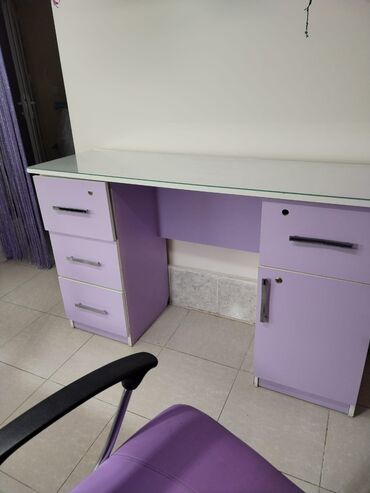 - Bənövşəyi rəngdə salon masası: üstündə şüşə masaüstü, iki tərəfdə çekmecəli və qapalı dolab bölmələri, alətlər və materiallar üçün geniş saxlama sahəsi.