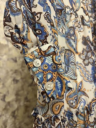 - Rəng və naxış: Ağ fon üzərində mavi, qəhvəyi və bej tonlarında paisley/çiçək motivləri