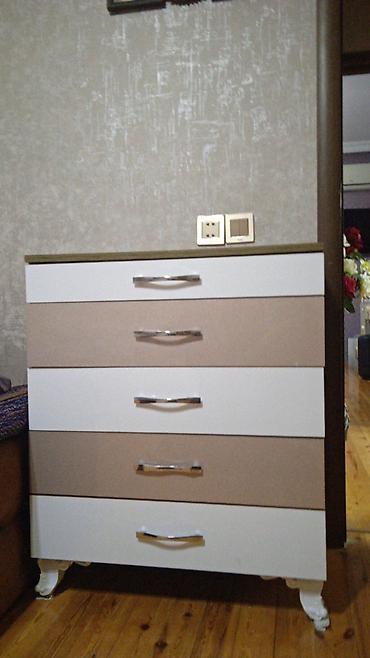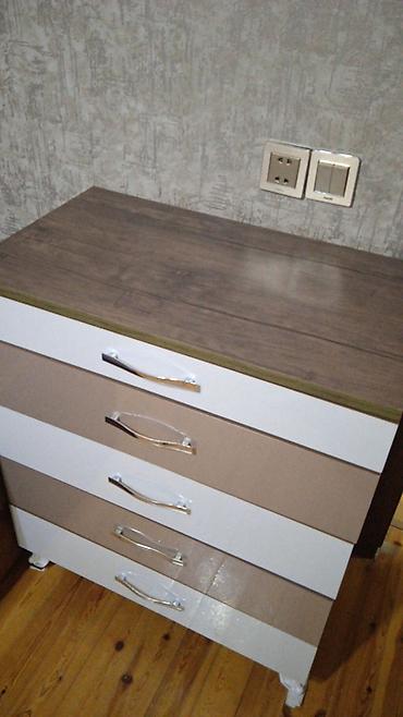 Mebel komodu – 5 çekməcəli - Model: dikdörtəbəy formalı komod - Rəng və material: qəhvəyi ağac teksturalı korpus, krem rəngli ön panellər; parlaq xrom rəngli dəstəkli tutacaqlar - Çekməcələr: ümum...