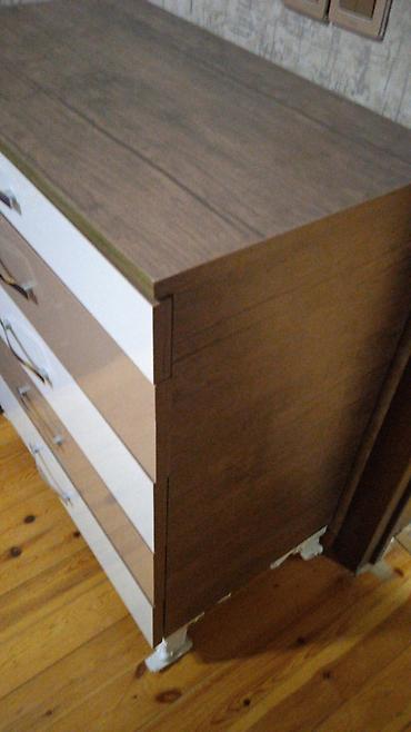 Dörd çekmecəli komod - Material: ağ MDF/LDSP gövdə, qoz ağacı teksturalı ön panellər - Ölçü təxmini: hündürlük ~80–90 sm, en ~70–80 sm, dərinlik ~45–50 sm (şəkillərdə göstərilən proporsiyalar) - Ç...