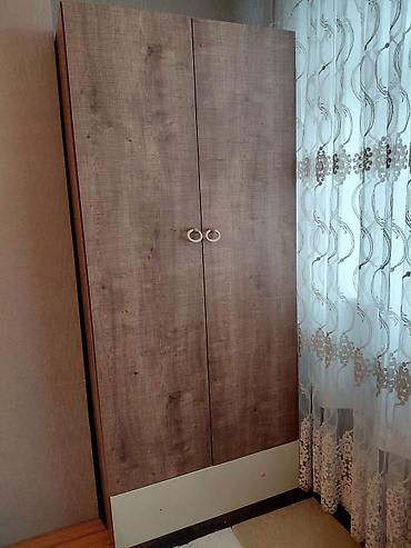 - Geyim şkafı: 2 qapılı, təbii ağac naxışlı laminat səth. Ortada dekorativ dairəvi tutacaqlar. Aşağı hissədə açıq rəng panel vurğusu. Gündəlik geyim və üst geyimlərinin asılması/qatlanması üçün geniş həcm (rəflər və asılqan yerləşdirmək üçün uyğun daxili quruluş).