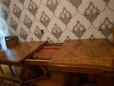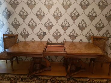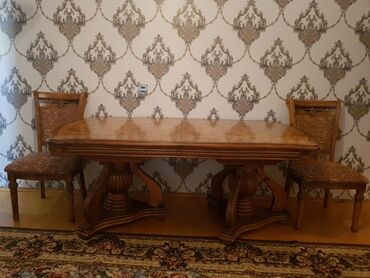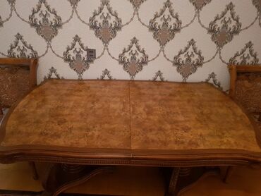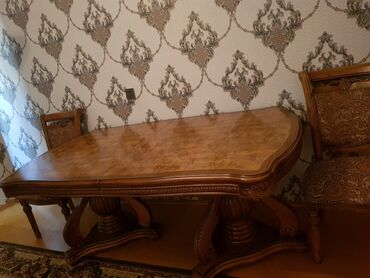 Oval formal masa və altı ədəd uyğun stuldan ibarət yemək dəsti. Masa tünd qəhvəyi rəngdədir və klassik üslubda oyma detallara malikdir. Stullar məxməri parça ilə üzlənmiş və arxalıqlarında oyma nax...