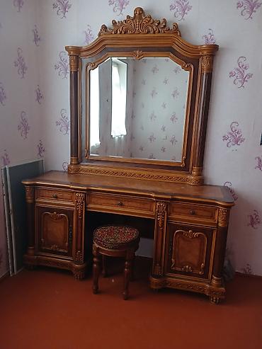 - Güzgülü tualet masası/komod (böyük çərçivəli güzgü, 3 çekmece, yanlarda qapılı dolablar, ortada oturacaq yeri; komplektdə yumru oturacaq)