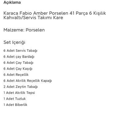 Türk istehsalı, Gelincik brendi. Porselen takımı. Yenidir. Qiymət 180 azn. Servisə daxildir: 4 dərin dolma qabı, 11 derin aş boşqabı, 12 böyük boşqab, 11 orta boşqab, 9 kiçik boşqab, 6 kasa, 10...