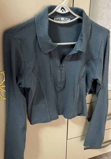 Mavi qadın bluzu - Model: Uzunqol, qısa kəsim - Yaxa: Drapeli/şal