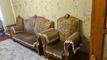 - 3 yerlik taxta karkaslı divan, 2 ədəd geniş kreslo