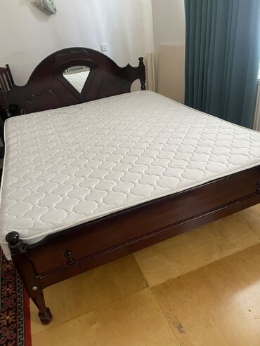 Taxta çarpayı və döşək dəsti - Material: massiv ağac karkas, klassik oyma başlıq və ayaqlıq - Ölçü: təxmini ikinəfərlik (standart iki nəfərlik döşək ölçüsünə uyğun) - Başlıq: taxta konstruksiya, d...